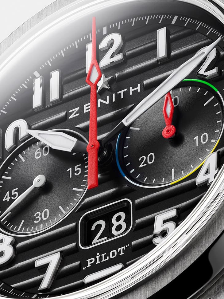 ▲真力時新一代Pilot系列面盤經過大改造,多了水平條紋裝飾,時標與指針造型也和上代明顯不同,另外30分計時盤的三色則是仿效過往的El Primero Rainbow。