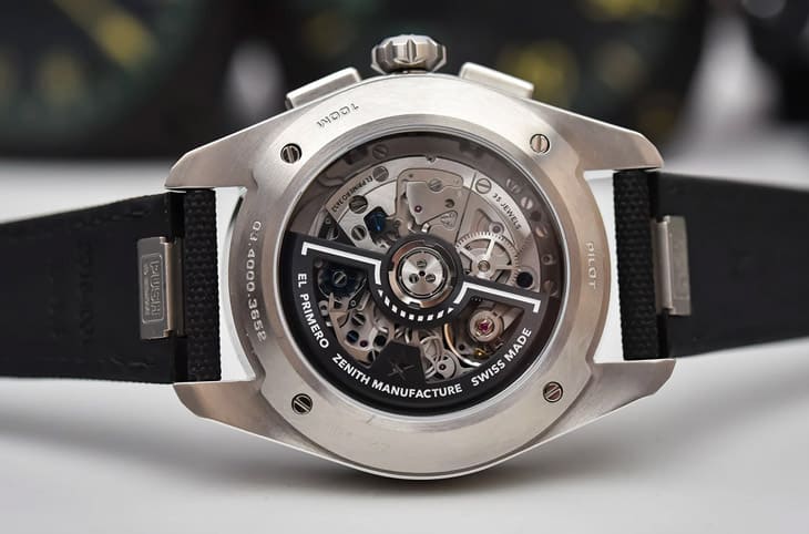 Pilot Big Date Flyback跳脫上一代的亮點之一包括背面改成了透明底蓋,這讓手錶內部的El Primero高震頻機芯終於可以見天日,El Primero 3652是一枚具有飛返功能的計時機芯,所以當需要計算連續事件時,它省略了要先停止-歸零-再啟動的步驟,能夠更即時地掌握時間脈動,對於飛行員而言這很重要。在透明底蓋下,機芯因應飛行錶淵源新採用的鍍黑「人工地平儀」造型自動盤散發屬於新一代Pilot系列的家族特徵,在大幅鏤空的自動盤下,機芯多達303枚零件組成的結構一目瞭然,你會輕易發現它的導柱輪鍍上了藍色,另外擒縱系統裡也含有現代科技的矽材質,藉以提升機芯的耐用度與抗磁性能,此外機芯內置ZENITH開發的專利機制,有助於大日期顯示的兩枚轉盤可以在0.03秒內同步傳動並保持穩定,再來它的動力儲存有60小時也是在水準之上。
