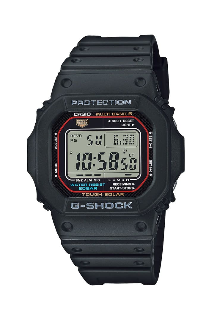 GW-M5610也是繼承了第一代G-SHOCK手錶的方形、紅色線條等經典設計元素。雖然它整體的設計可以說是初代G-SHOCK的嫡系後代,但它在功能上卻有著巨大的進步,例如配備Multi-Band 6世界六局電波接收和LED背光燈,使其更加實用。