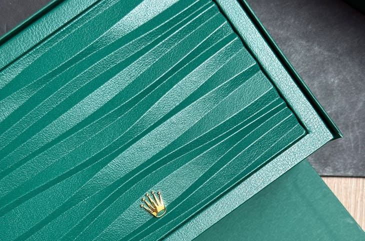 原本勞力士錶盒的外盒是米黃色的,表面中央還有個突起且大型的皇冠標誌,新版直接換成他們家經典的綠色,表面也改成燙金的Logo並且低調的縮小移到下方。