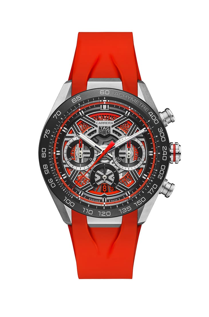 另款Carrera Chronograph x PORSCHE计时码表特别版正是双方2021年宣布合作计画时首发的作品,其以保时捷经典的红、黑、灰色贯穿整体设计,面盘的粒纹处理刻意仿效赛道上的沥青质感,甚至陶瓷表圈就开门见山地刻上保时捷的品牌名称,加上透明底盖露出特别版的Heuer 02机芯,泰格豪雅精心将镂空自动盘改为保时捷车款方向盘的造型,再度将车厂的速度灵魂挹注在手表内外设计中。