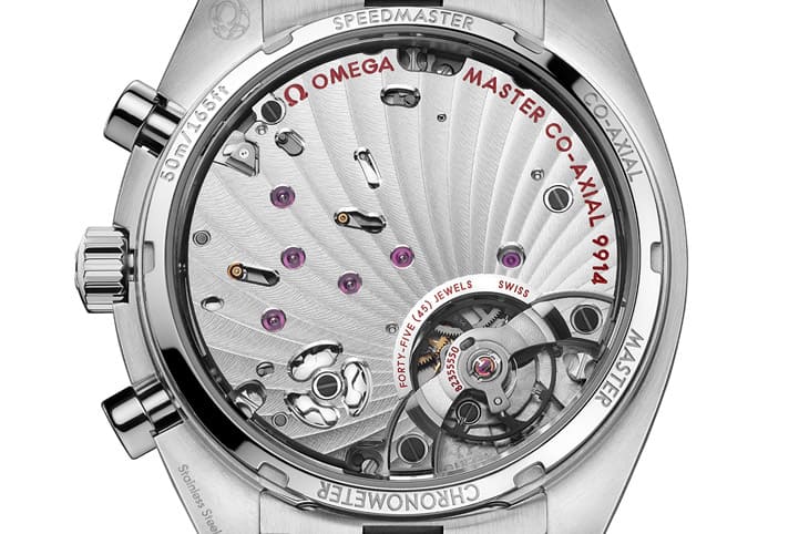 由於OMEGA過去還沒有南北半球月相顯示的作品,因此超霸月相隕石計時碼錶搭載的9914手上鍊機芯自然是全新創作,這款錶用透明底蓋露出完整的機芯基板,逾3/4夾板的設計讓人可以愜意欣賞超大片的藤蔓花紋式日內瓦波紋,包括擺輪的橫跨式橋板也同樣可見具有連貫性的日內瓦波紋,這枚機芯結構相對複雜,因此它的寶石數達到45顆,不過它的震頻(4Hz)以及動力儲存(60小時)都還是跟上現代主流規格,尤其它又是通過大師天文台認證的作品,各項性能、精準度比起瑞士天文台水準有過之而無不及,15,000高斯的抗磁能力更是傲視多數手錶的關鍵優勢。