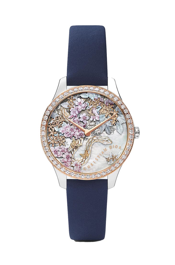 錶款的設計靈感源自迪奧經典的Toile de Jouy圖案,由於手錶具有生肖錶的身份,因此別開生面將2025年作為生肖主角的蛇形圖案融入其中,展現出DIOR傳承自家歷史再加以創新的實驗精神。手錶面盤採用白色珍珠母貝材質,並以珍珠母貝和 18K玫瑰金勾勒出精緻的蛇形圖案,看著蛇形圖案蜿蜒靈動的造型,彷彿牠就生活在面盤般栩栩如生。這條金蛇穿梭於由珍珠母貝和黃金打造的繁茂花葉之中,周圍環繞著玫瑰金製成的蝴蝶,營造出自然景物的和諧景象,散發生動迷人的魅力。面盤下方不忘點綴CHRISTIAN DIOR標誌,在這麼華麗又充滿視覺張力的面盤上,太子妃式的玫瑰金時針和分針反而成了配角般的存在,讓美麗的面盤多了顯示時間的附加效果。