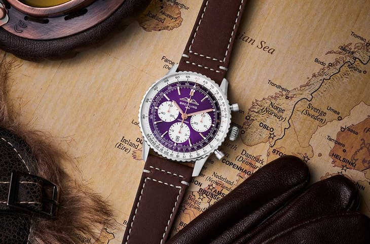 Navitimer系列近年來陸續推出許多面盤款式,這款高登鐘錶聯名款別開生面換上其代表性的紫色面盤令人眼睛一亮,也為經典的Navitimer飛行錶注入了新的活力。換上紫色面盤之餘,面盤外緣刻度為米白色調,內側的立體BREITLING標誌、時標與指針等都是高貴的玫瑰金色調,對照飛行滑尺的部分刻度也有相近的顏色,精心配色替手錶營造一股低調奢華感。雖然是與高登鐘錶合出的聯名款,不過這款錶和一般Navitimer B01 43完全相同(除了面盤顏色不同),雙方並沒有刻意在面盤加上高登鐘錶相關元素,純粹用少見的配色來展現悉有意義。