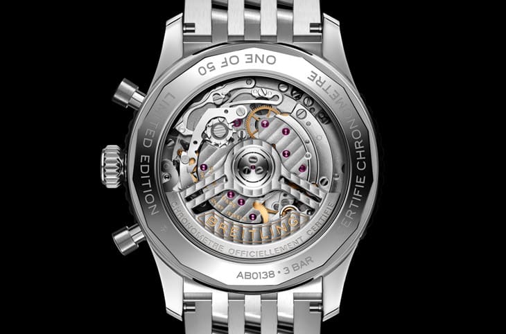 透明底蓋下方露出B01自動上鍊機芯,這枚機芯是市場上頗具口碑的計時機芯,內部含有導柱輪和垂直離合機制,並具有47顆紅寶石,複雜結構確保計時成果精準可靠。機芯的擺輪每小時震動28,800次(4Hz),對於捕抓更詳盡的時間隔有所助益。B01機芯能達到1/4秒計時碼錶的數準,並配備30分鐘和12小時計時盤,錶主能輕鬆依靠它來準確測量時間,而且機芯的動力儲存也達到70小時之譜,日常佩戴綽綽有餘。
