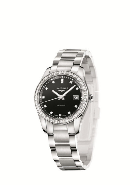 這枚女裝手錶錶殼直徑29.5毫米,採用精鋼製造,鑲有30顆閃爍璀璨美鑽 (共重0.501克拉),內藏L595機械機芯。黑色錶面上襯以12顆鑽石刻度。時、分、秒,日期顯示則設於3時位置。一如整個Conquest Classic系列,手錶防水功能達5 bar,並配以旋入式藍寶石水晶錶背。