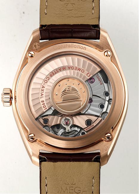 Master Co-axial的優勢之一就是它的防磁性能來自本身就防磁的機芯零件,而非軟鐵內殼,因此可以做透明底蓋;中央的天文台圖案是星座系列的經典特徵,天空的八顆星星分別代表了當年品牌的八項紀錄。
