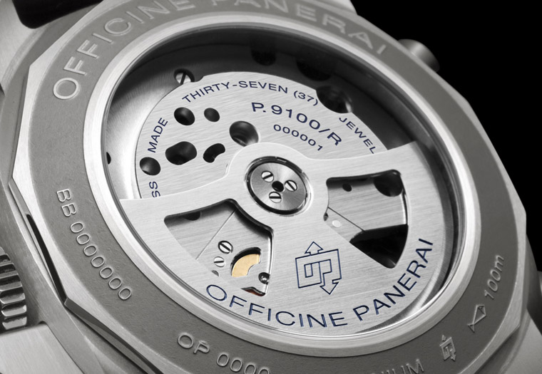 P.9100/R自動上鍊機芯是首款完全由沛納海自行設計、研發、生產而具有帆船賽倒計時功能的自動計時機芯。 簡單來說它是P.9100自動機芯的改良版,本身具有飛返計時功能和導柱輪;直徑一樣(13¾法分),由於比P.9100增加了26枚零件(總數為328枚),所以機芯的厚度也略增,理所當然的,這增加的厚度就是用於新增的倒計時功能上。