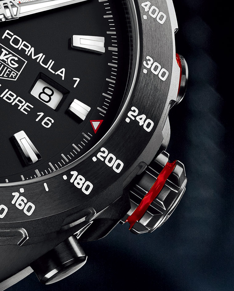 錶款配有重新打造的44毫米錶殼,其中Full Black型號更設有黑色碳化鈦塗層錶圈,整只錶屬全黑格調,輔以火紅細節點綴,指針和棒形小時詩標造型寬厚,並加以夜光處理,讓在「一片黑」的面盤或暗黑環境中仍可清晰閱時。這款Full Black型號代表了Formula 1系列對科技、運動和設計上的極致追求,正如TAG HEUER總是以累積百年的工藝為後盾,在技術上不斷推陳出新,以追求更令人驚豔的表現。