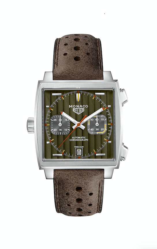 不鏽鋼錶款配搭棕色皮革錶帶,錶帶孔內襯淺棕色,綠色面盤備有棕色和黃色元素,搭配日內瓦條紋裝飾,指針塗有SuperLuminova®夜光塗層。小面盤和錶冠位置讓人一眼即可辨識這款跳脫傳統的Monaco系列腕錶。錶款搭載著名的Calibre 11機芯,可以說是對1969年原版Monaco手錶首次登場的自動計時機芯的現代演繹版本。