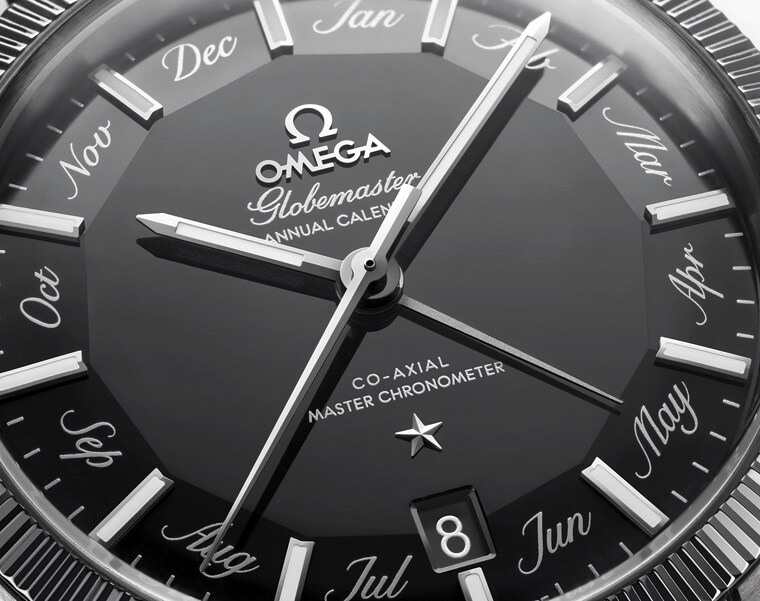 星座系列面盤的八卦面造型原本只是一項裝飾性的設計(立體分割的盤面或許有助於區隔12個小時,對視讀性多少有些幫助),不過這款年曆款卻活用了這項設計,讓它在功能上也有了意義。而其實OMEGA的8500系機芯很早就發展出年曆模組了,不過之前它都是靠視窗來表示月份,然而這款卻將月份罕見改成了中央指針的形式,而八卦面外緣的12個切面正好就用來標示12個月份,以比較特別的形式來顯示月份資訊。