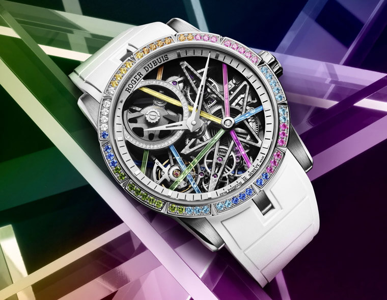Excalibur Blacklight限量版以白金材質製作錶殼,錶圈上的多色寶石包括藍寶石、電氣石與石榴石,總計達60顆,約重1.1克拉,它的錶徑42mm對於亞洲人而言不會顯得負擔沉重。羅杰杜彼替錶款配置的是白色橡膠錶帶,這與錶款散發的優雅貴氣剛好可以呼應,有別於Excalibur系列與人的粗獷形象,反倒呈現出一絲斯文的氣質。