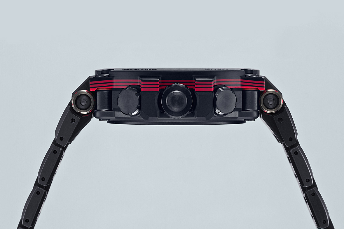 ▲立體感的錶圈是由兩層碳纖維薄片與彩色玻璃纖維塑膠混合樹脂所製成,MTG-B1000XBD採用紅色分層,而MTG-B1000XB則採用白色分層。