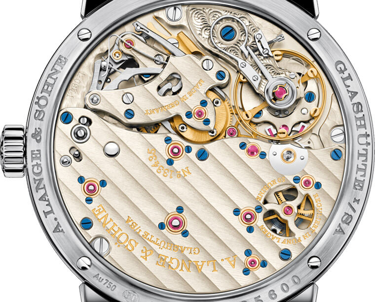 RICHARD LANGE跳秒錶搭載的L094.1機芯共由390枚零件組成,或許你會有點疑問,三針加上跳秒的機芯結構怎麼如此複雜?實際上是因為錶款除了具備跳秒機制,它還同時擁有恆定動力擒縱和秒針歸零總共三項有助於突顯與強化腕錶走時精準度的複雜裝置。這三種裝置各有各的作用,以跳秒機制為例,它有一套自己的專屬輪系用以在固定的頻率下釋放同樣大小的動能,傳統上石英錶比較常使用跳秒機制,目的是為了節省電能,而機械錶多數是運用掃秒型態的連續作動方式顯示秒數,然而並非石英錶就一定等於跳秒、機械錶只能做成掃秒,只需修改機芯結構,兩種顯示方式無論石英機芯或機械機芯都可以達成;近年跳秒機械錶的比例有小幅升高的現象,它一方面是錶廠為了展現自己成熟的技術水準,同時秒針以逐格跳進的方式運作,看起來也更能精準顯示時間運作的軌跡。而恆定動力擒縱則是解決了發條盒在滿鍊與接近空鍊時扭力分佈不均情況,使得機芯的走時規律能夠總是保持一致、秒針歸零可以讓校對時間更省力及精確。從以上朗格的設計出發點中不難理解為何L094.1的複雜度會高出一般時、分、秒顯示腕錶一截,背後也可以反映出品牌製錶力求盡善盡美的職人匠心。