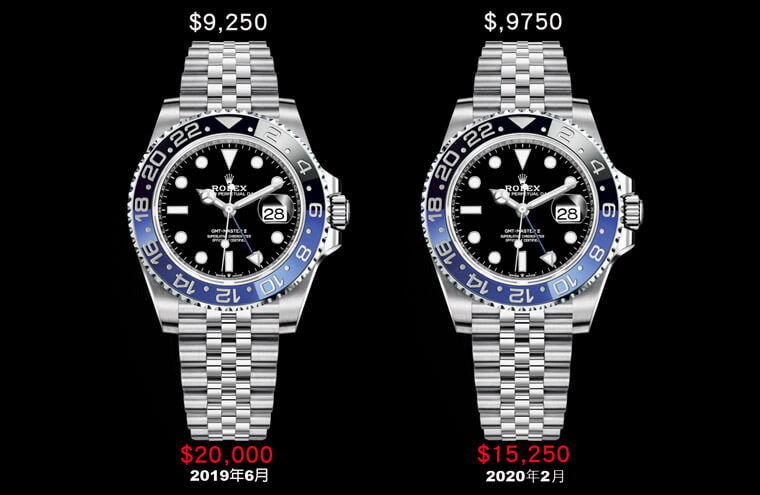 然而這種預期漲價的心態從最近美國錶友分享的情報來看,似乎又跟我們想像得有點不一樣⋯⋯這位美國錶友表示,GMT-Master II藍黑圈126710BLNR(Batman)2019年6月時的定價是美金9,250,實際的市場成交價格則是超過兩倍的20,000,結果到2020年2月,126710BLNR的定價已經調漲到美金9,750,那麼你覺得現在Batman在美國市場實際的入手價會是多少?