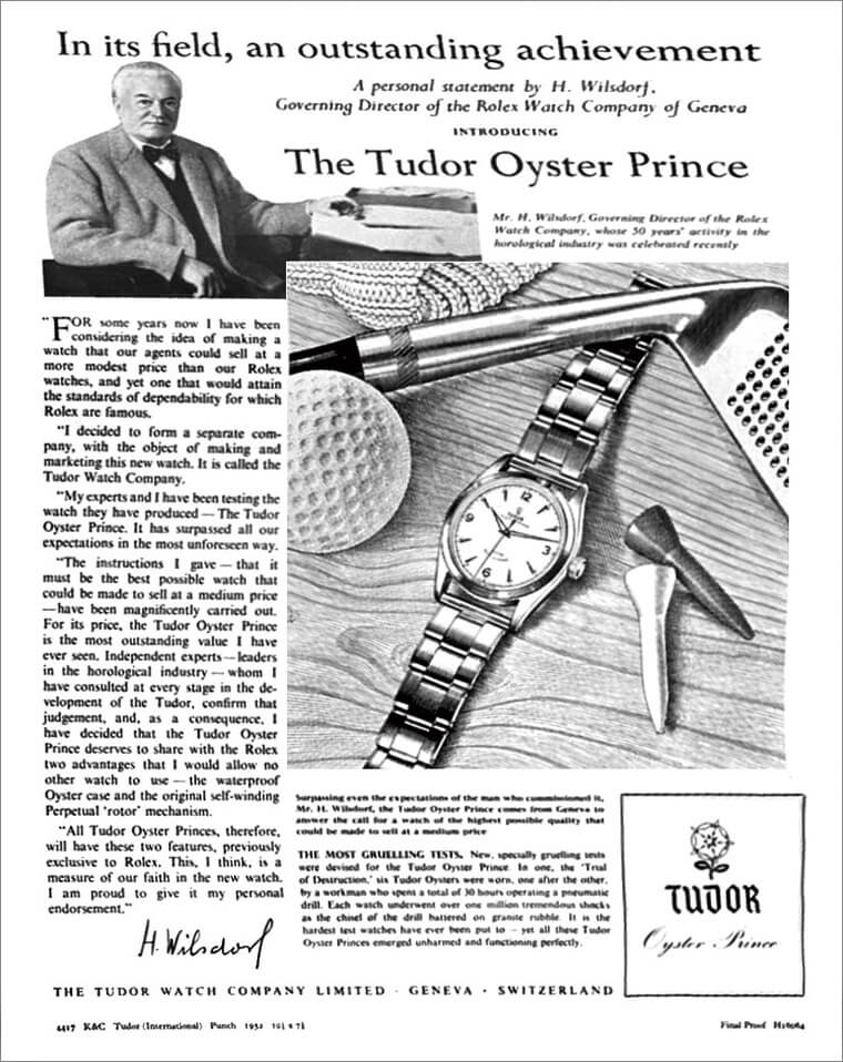 ▲圖為TUDOR創立初期在報刊雜誌上刊登的廣告,上頭可見勞力士創辦人、也是一手催生帝舵的Hans Wilsdorf身影。